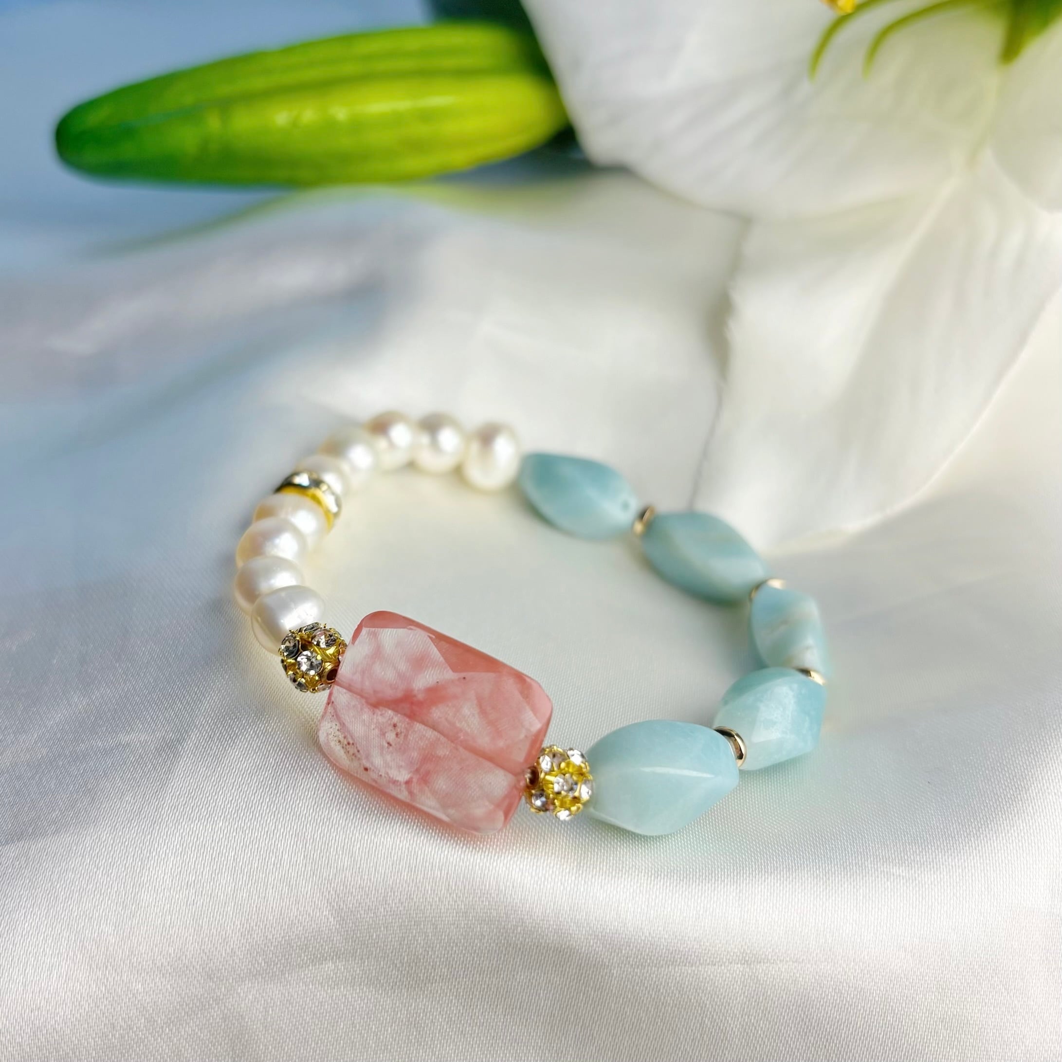 人魚姫のあくび<チェリークォーツ×淡水真珠×アマゾナイト×ヘマタイト> パワーストーンブレスレット