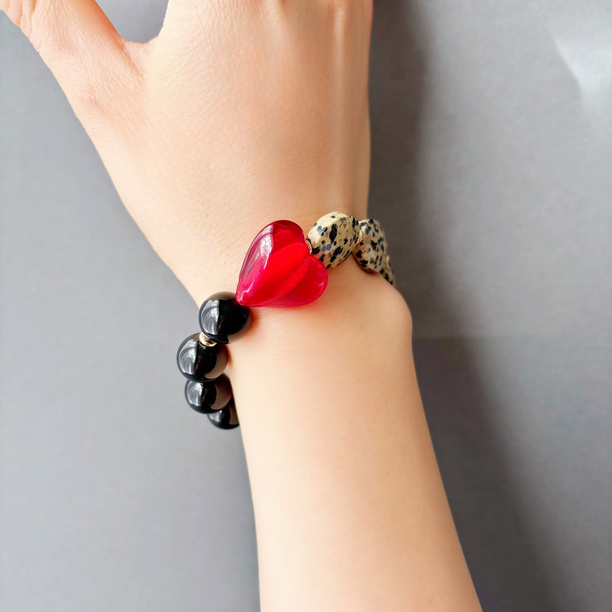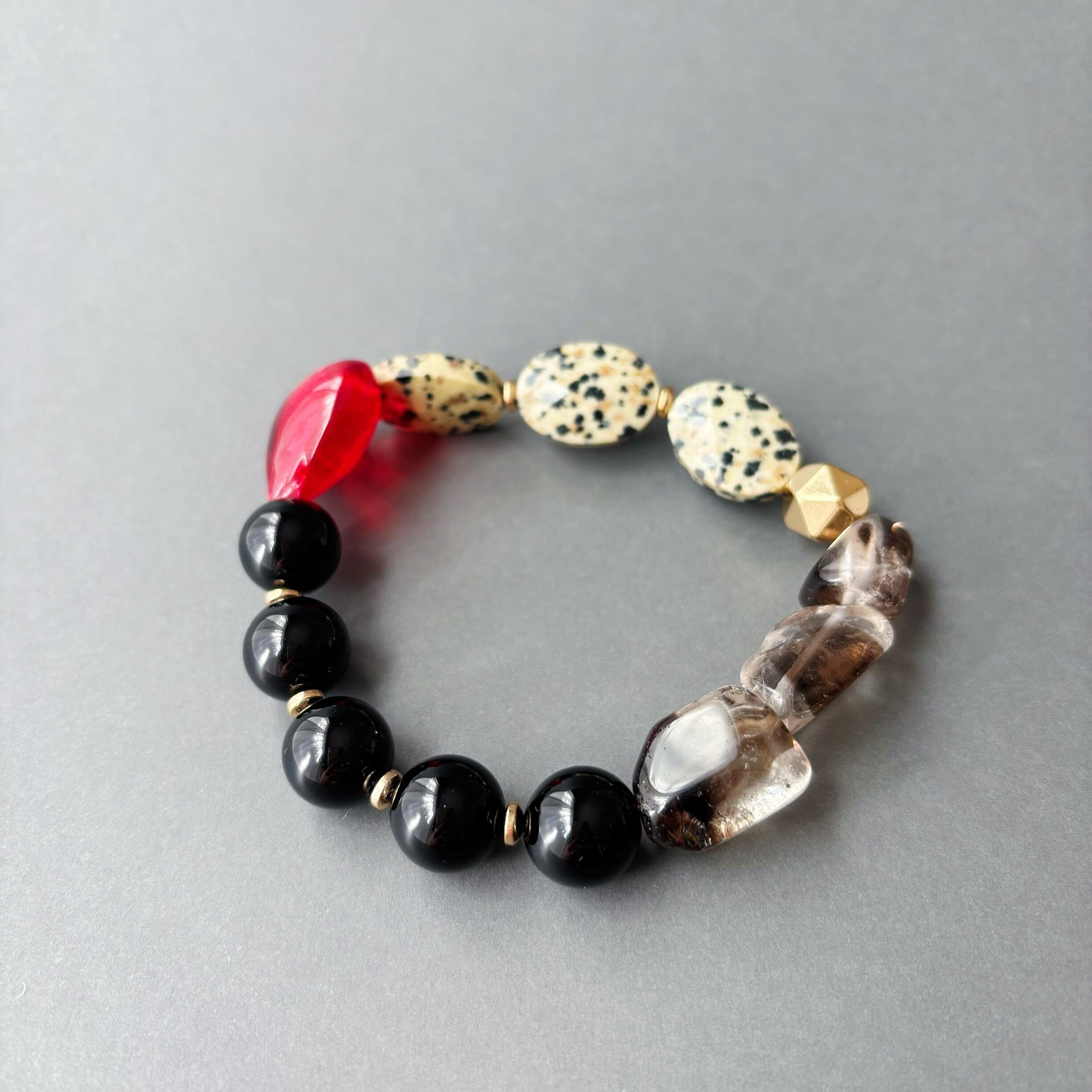 個性的なダルメシアンジャスパー、シックなオニキス、クリアで落ち着いた輝きが美しいスモーキークォーツ、ドギマギするような情熱的な赤いガラスのハートを組み合わせ、石の間にはゴールドのヘマタイト添えました。