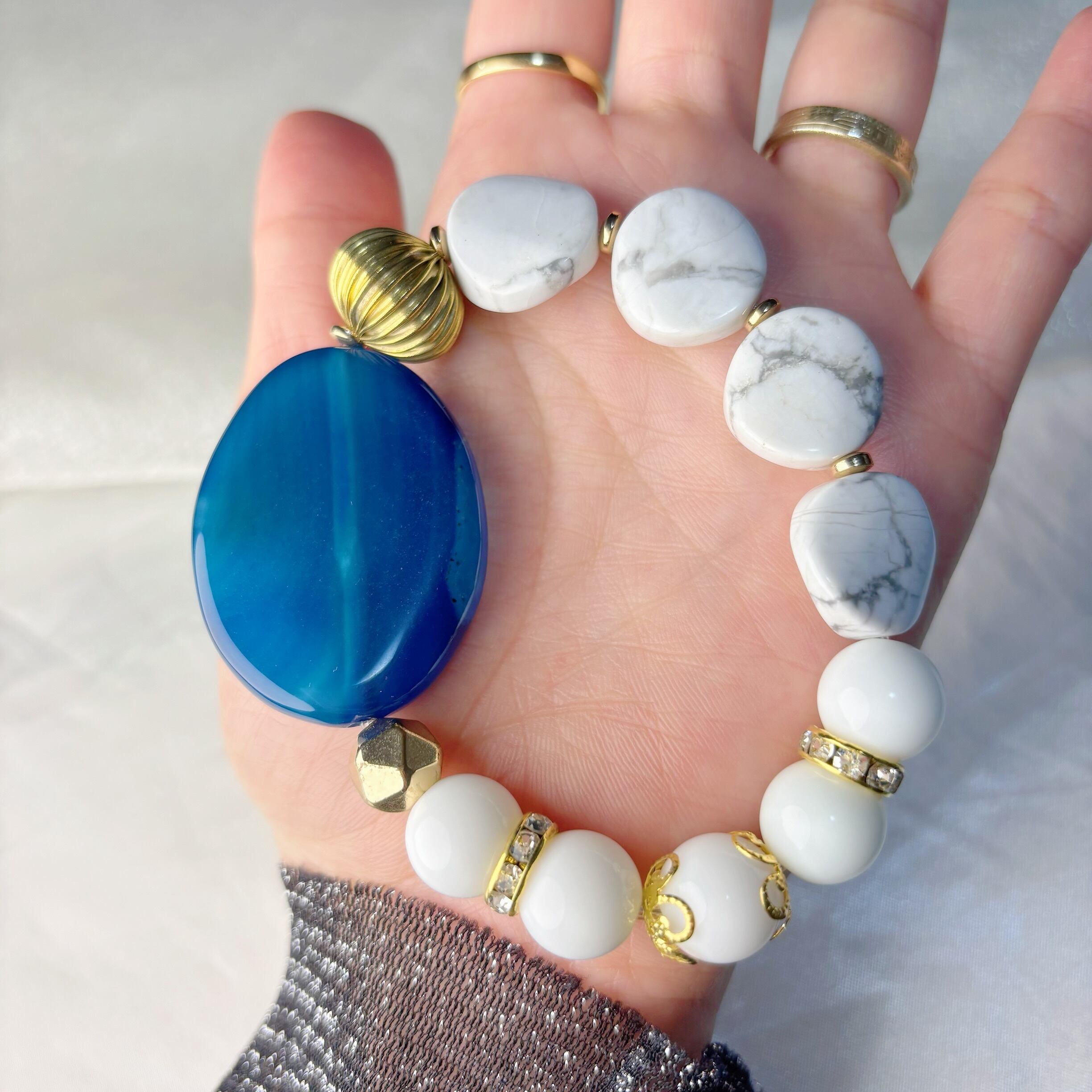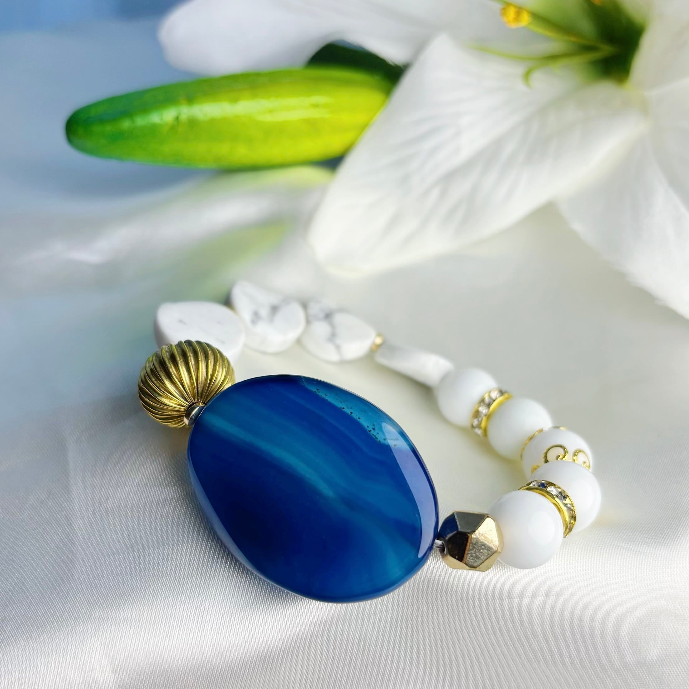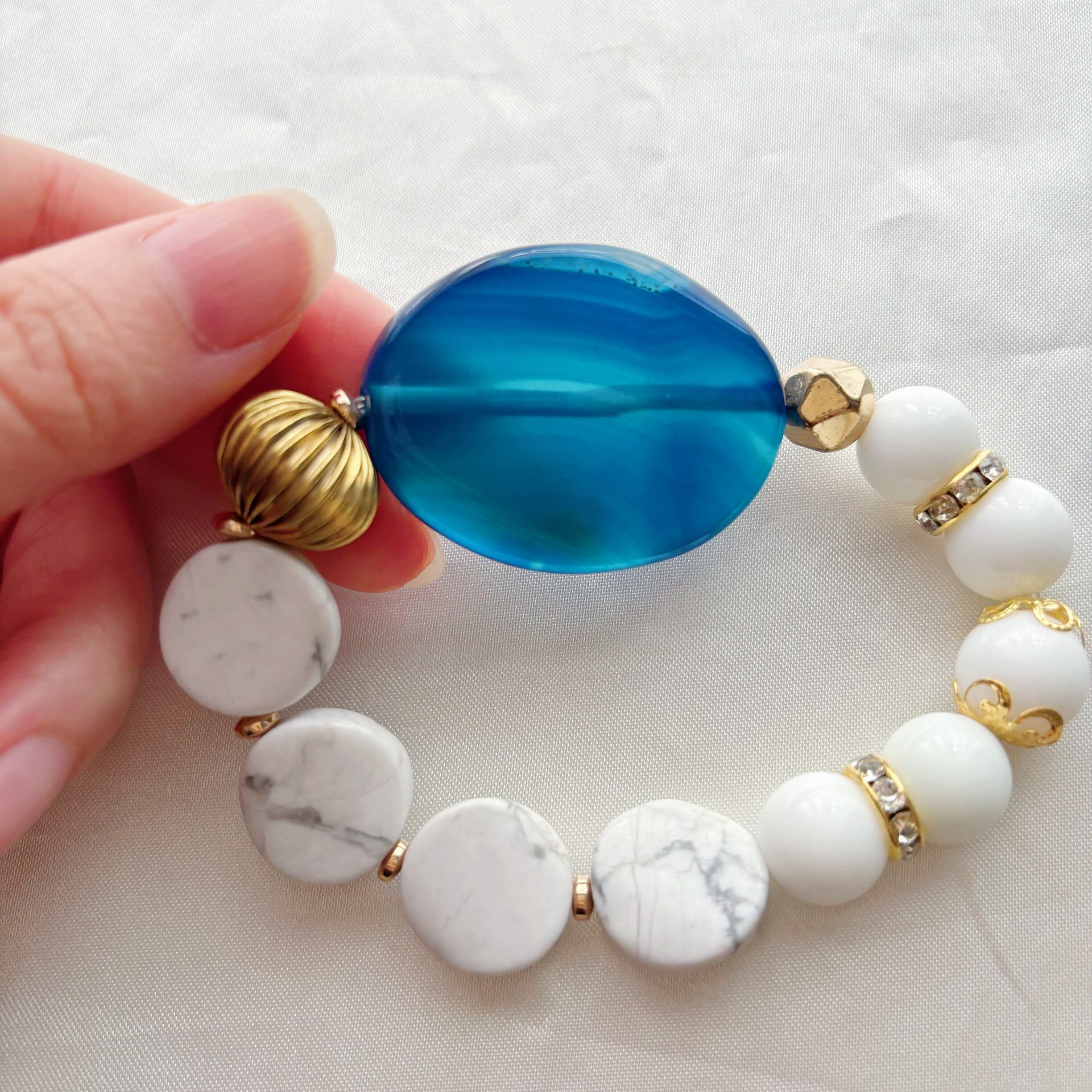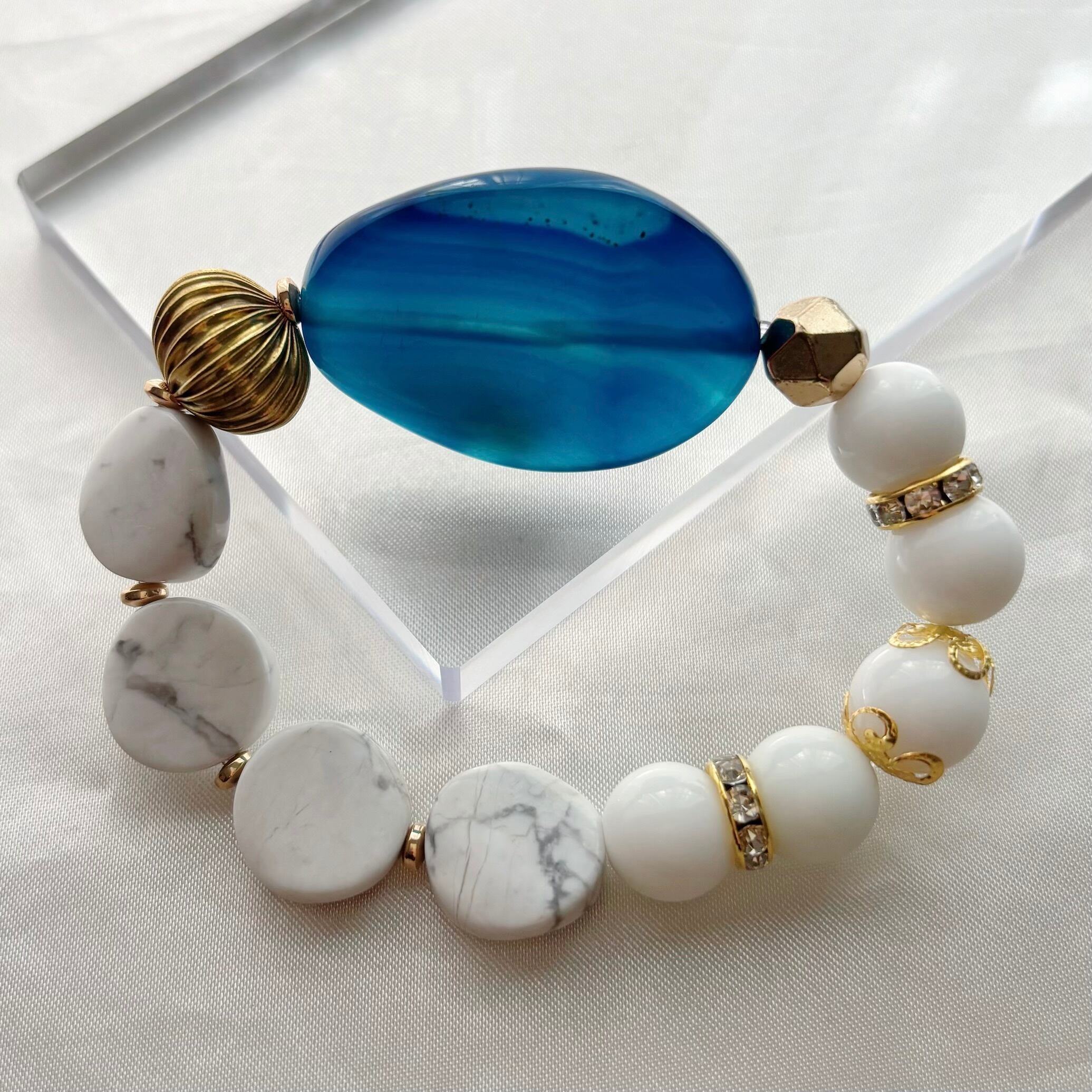 シンプルな服ほど差がつく知性と余裕をまとう青と白の大人の天然石ブレスレット<ブルーメノウ×ハウライト×ヘマタイト>