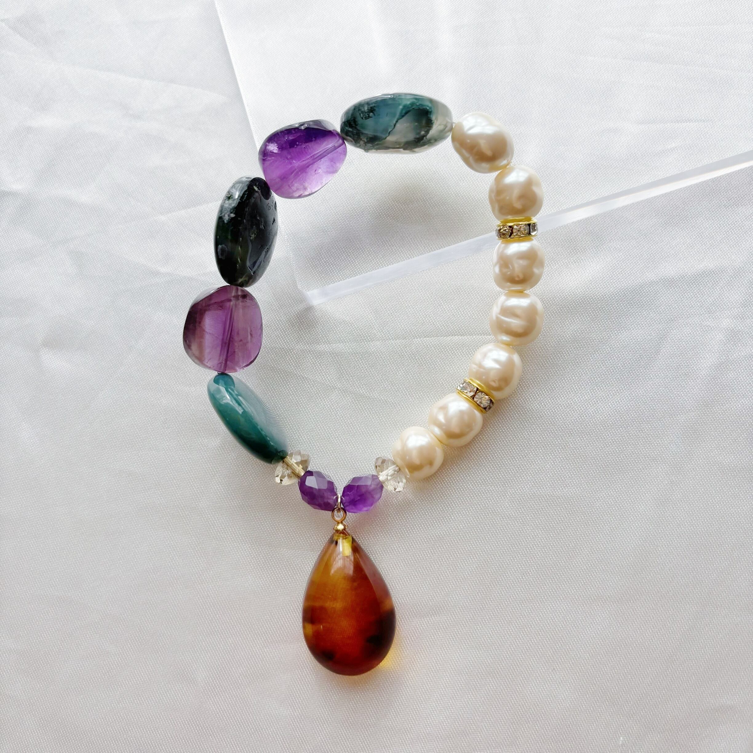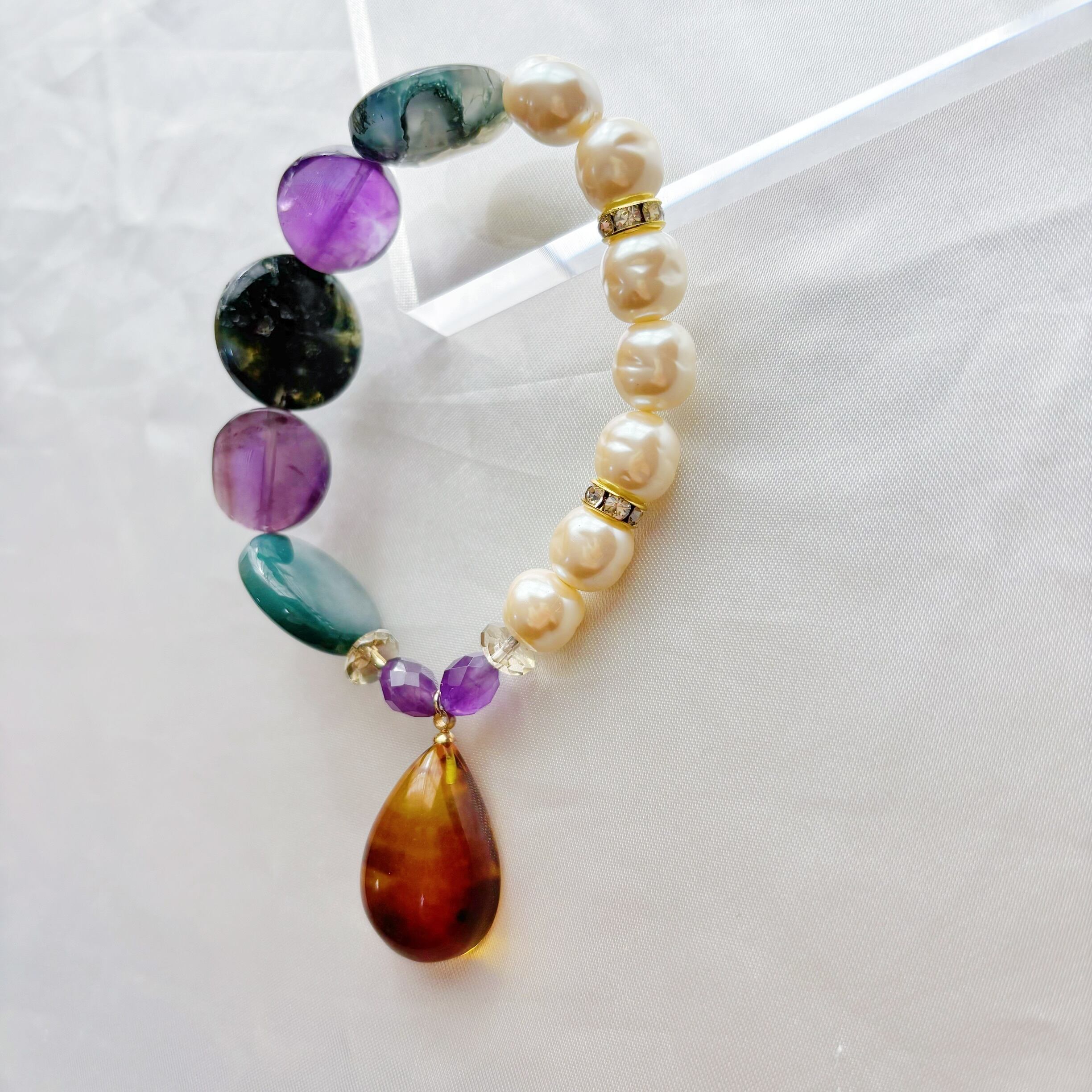秋冬コーデになじむ!<べっ甲×貝パール×アメジスト×インディアンアゲート×シャンパンクォーツ>大人こっくりパワーストーンブレスレット