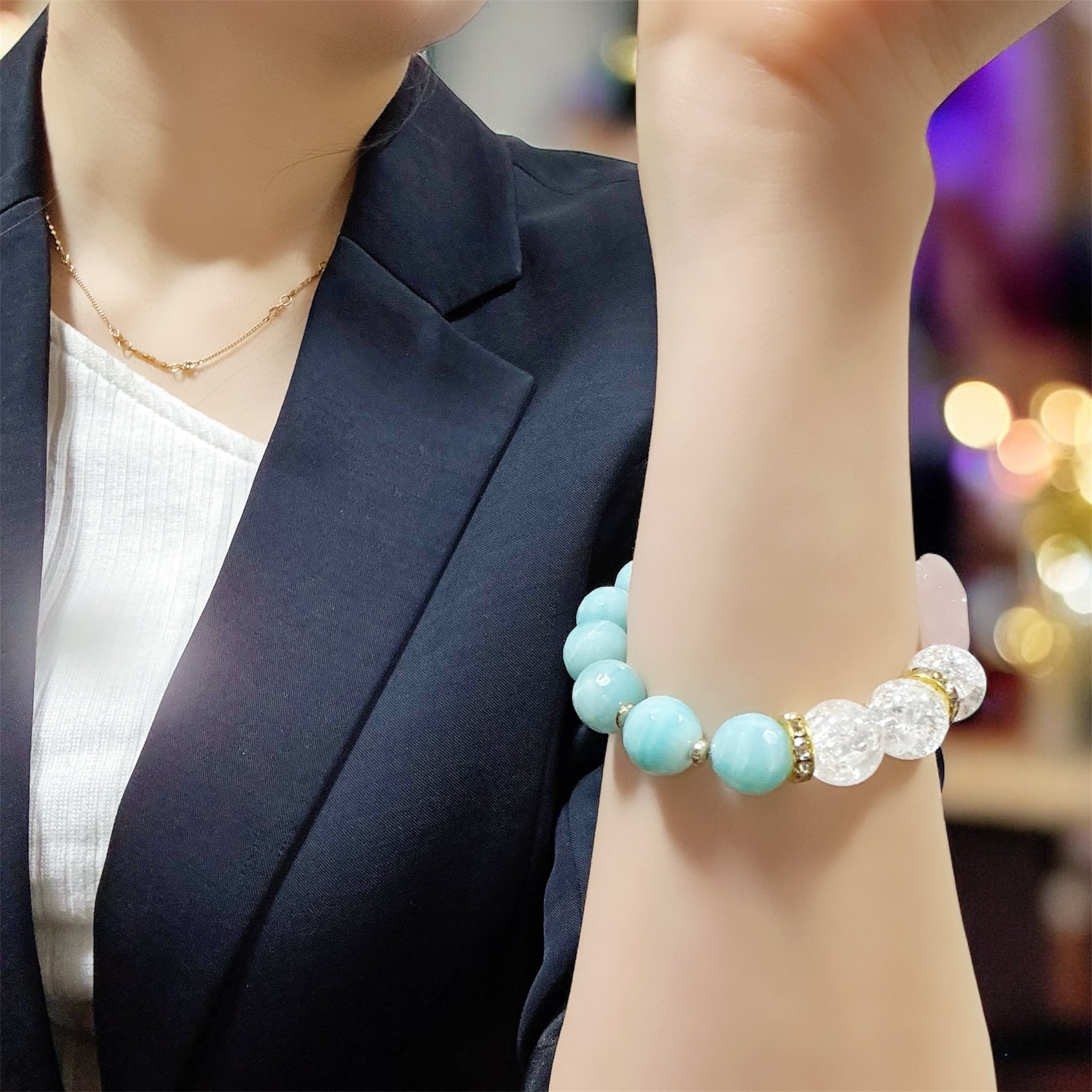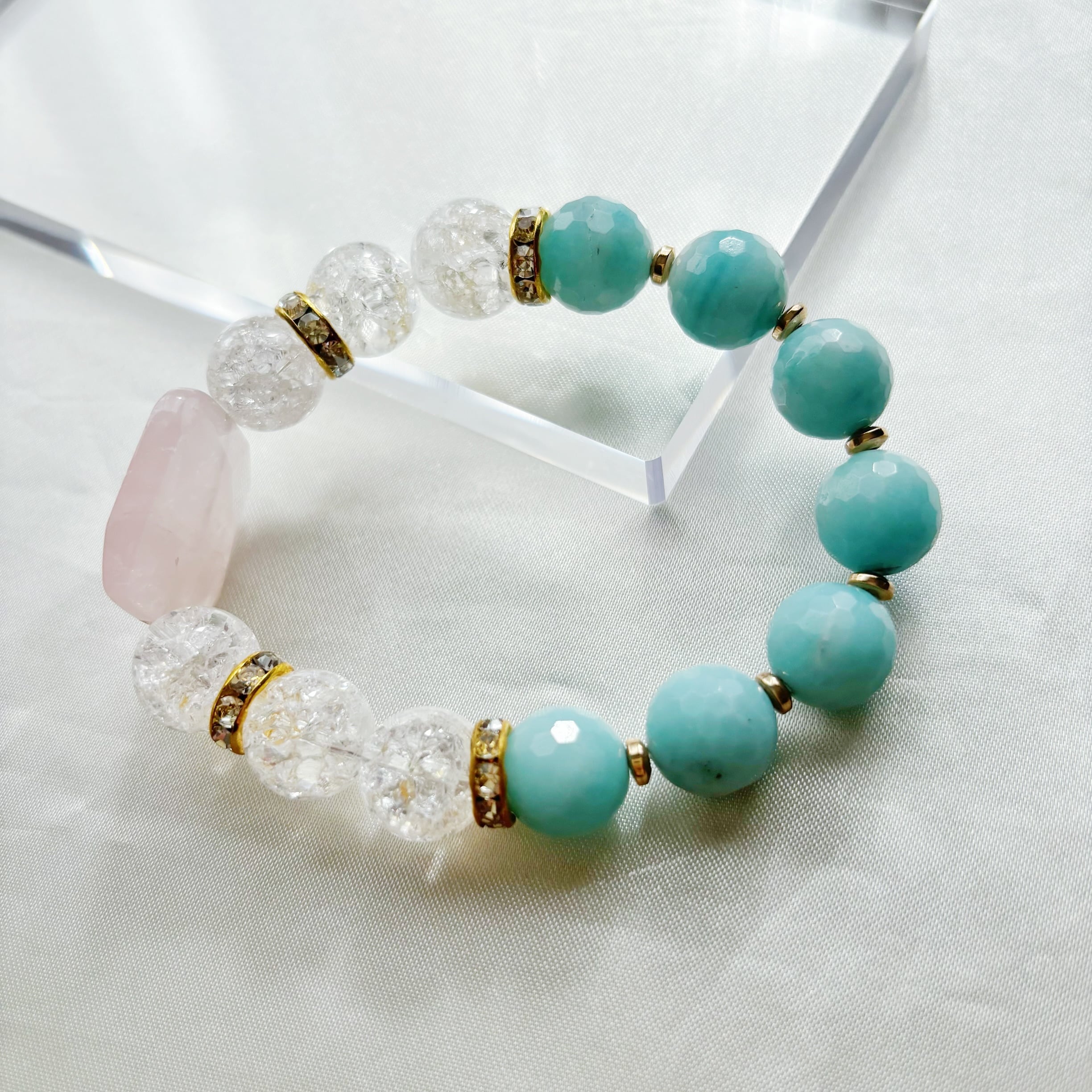 穏やかな海を閉じ込めた<ローズクォーツ×アマゾナイト×クラック水晶×ヘマタイト>人魚姫パワーストーンブレスレット