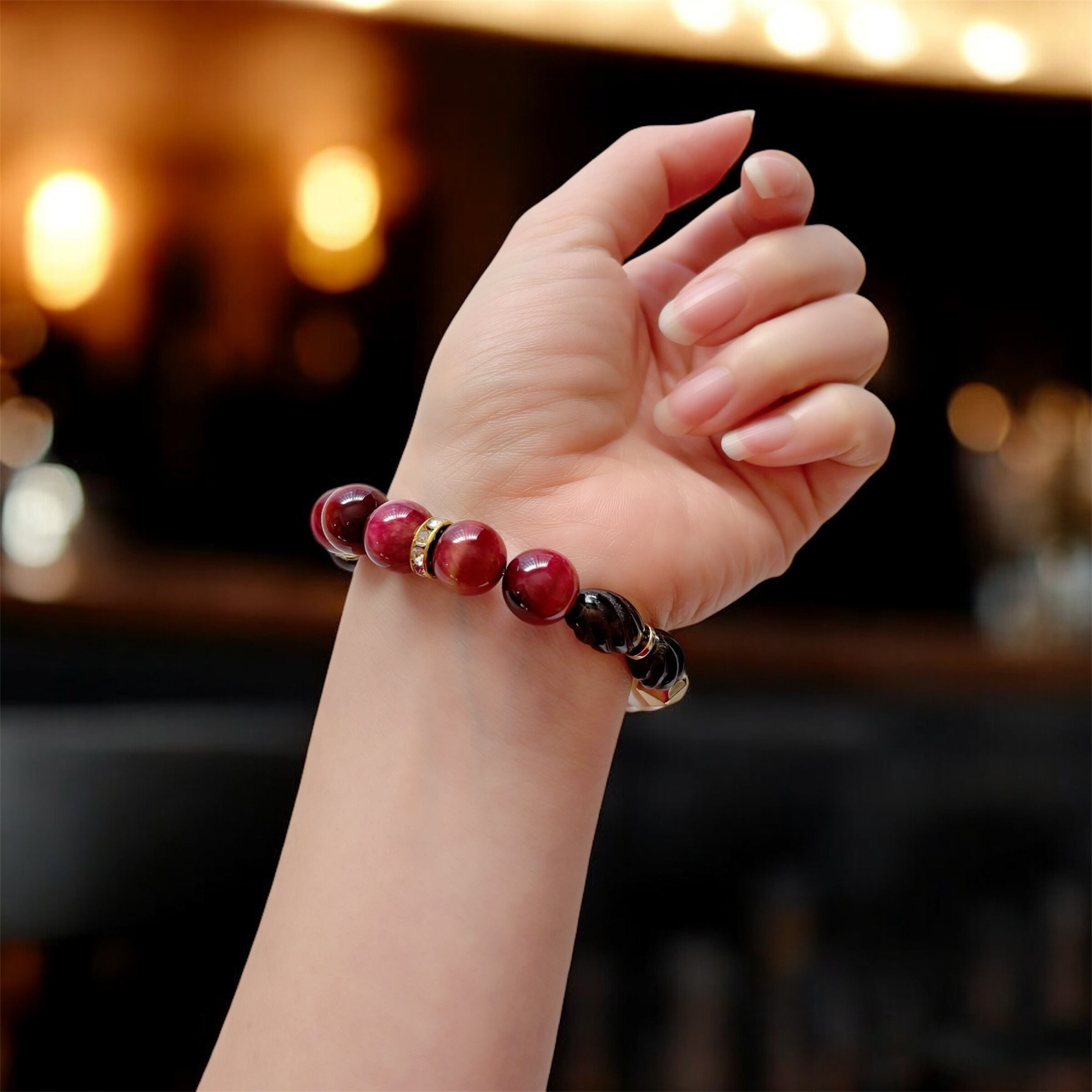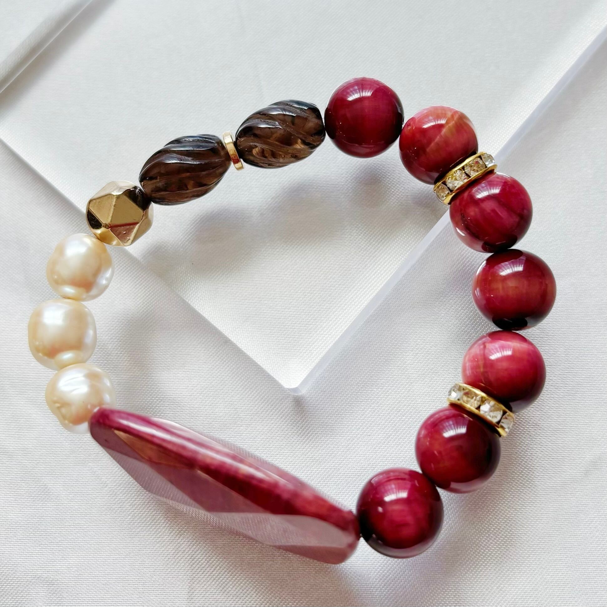 ボルドーのロードナイトで品と大人の余裕を!色っぽパワーストーンブレスレット<ロードナイト×ラビットアイ×貝パール×スモーキークォーツ×ヘマタイト>