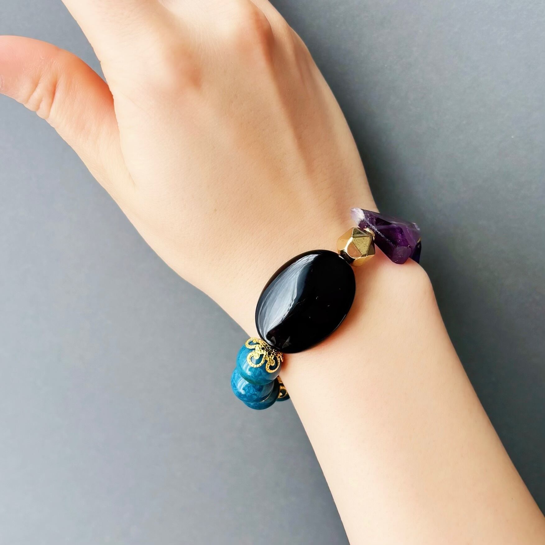 【再販】夜明けの静謐ージュエリーを纏うような大人のブルーパワーストーンブレスレット<アパタイト×アメジスト×オニキス×ヘマタイト>