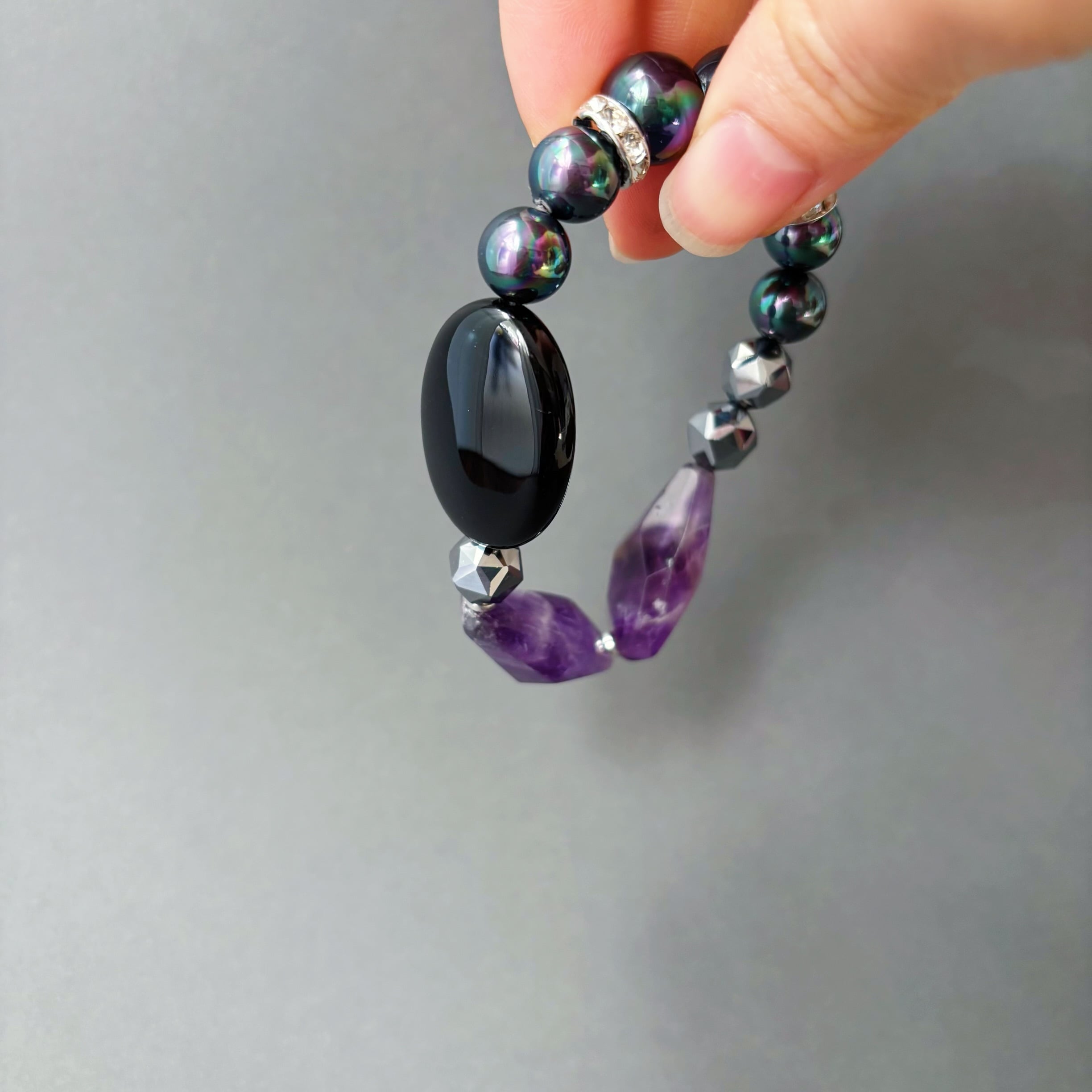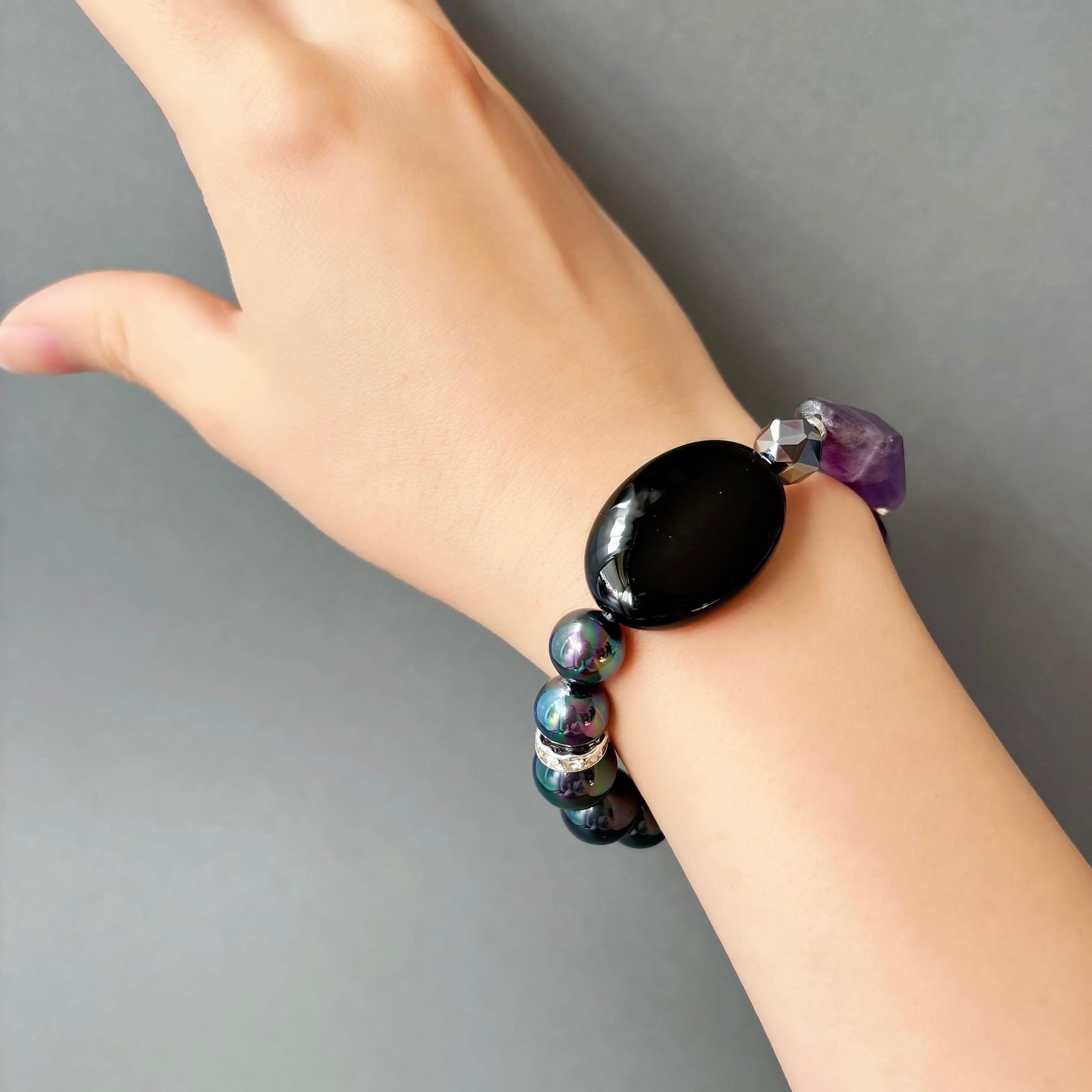 ジュエリーを纏うように艶めく黒×紫で大人の上品ダークな天然石ブレスレット<貝パール×アメジスト×オニキス×ヘマタイト>
