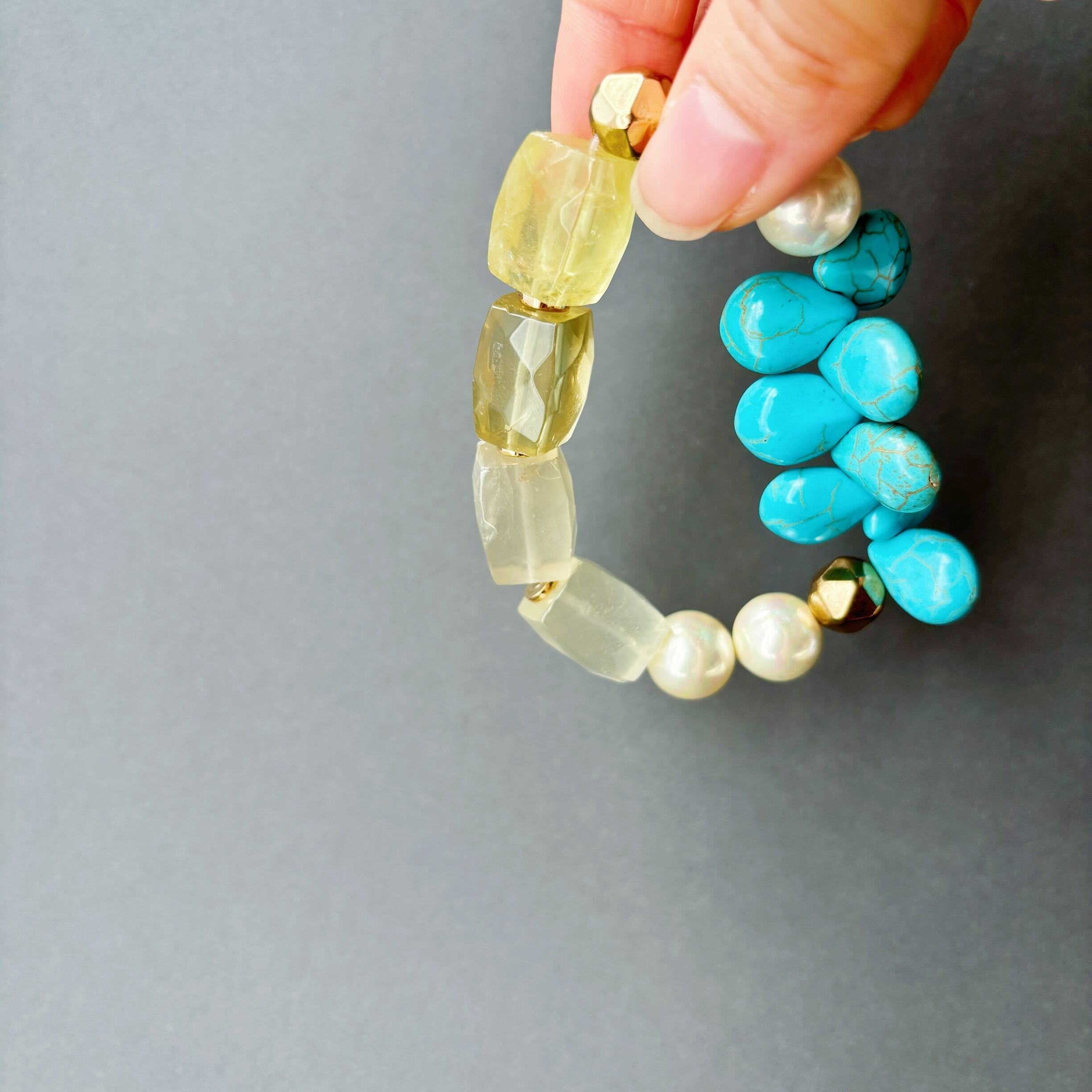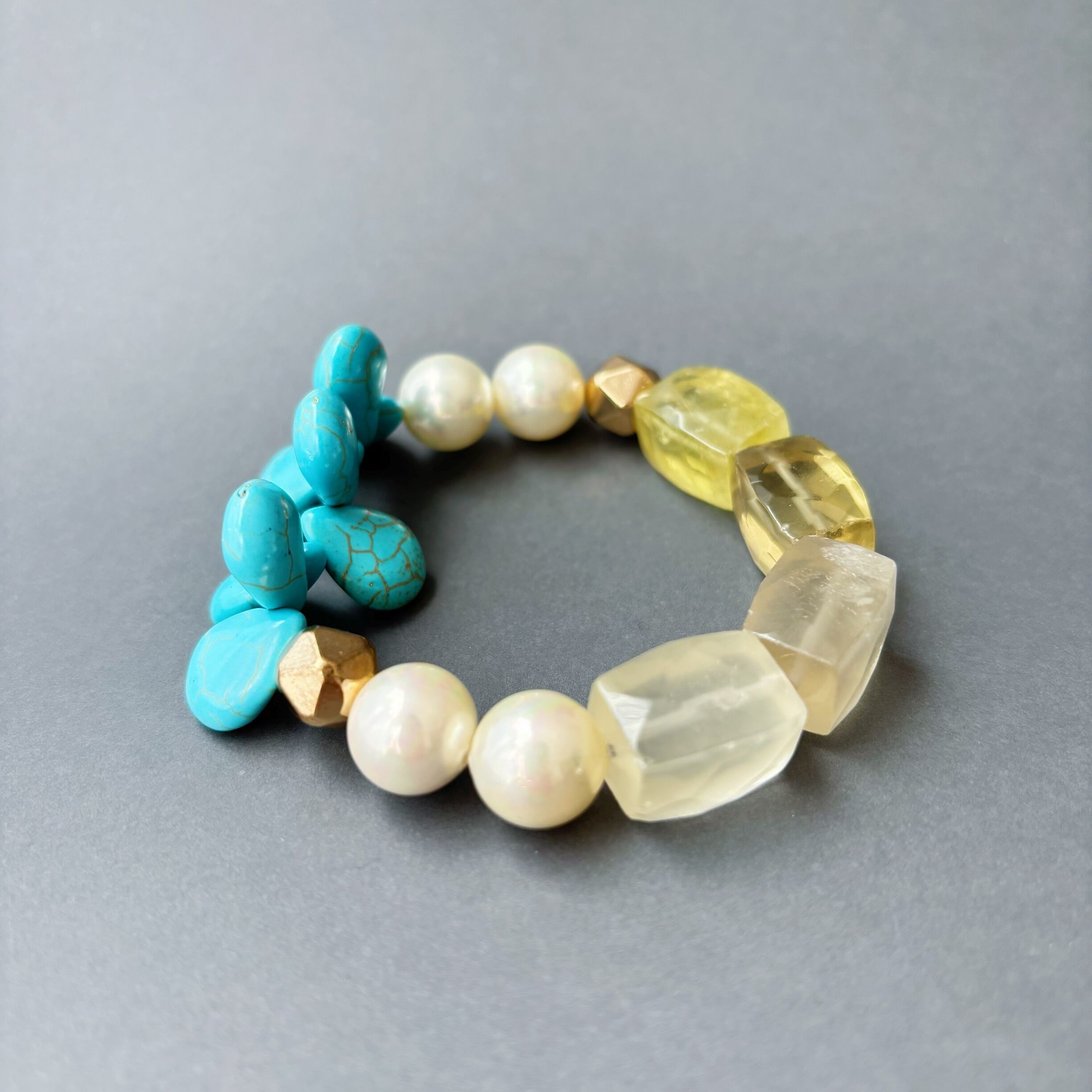 うららかな春を手首にまとう春色ミモザカラーのパワーストーンブレスレット<レモンクォーツ×ターコイズ×貝パール×ヘマタイト>