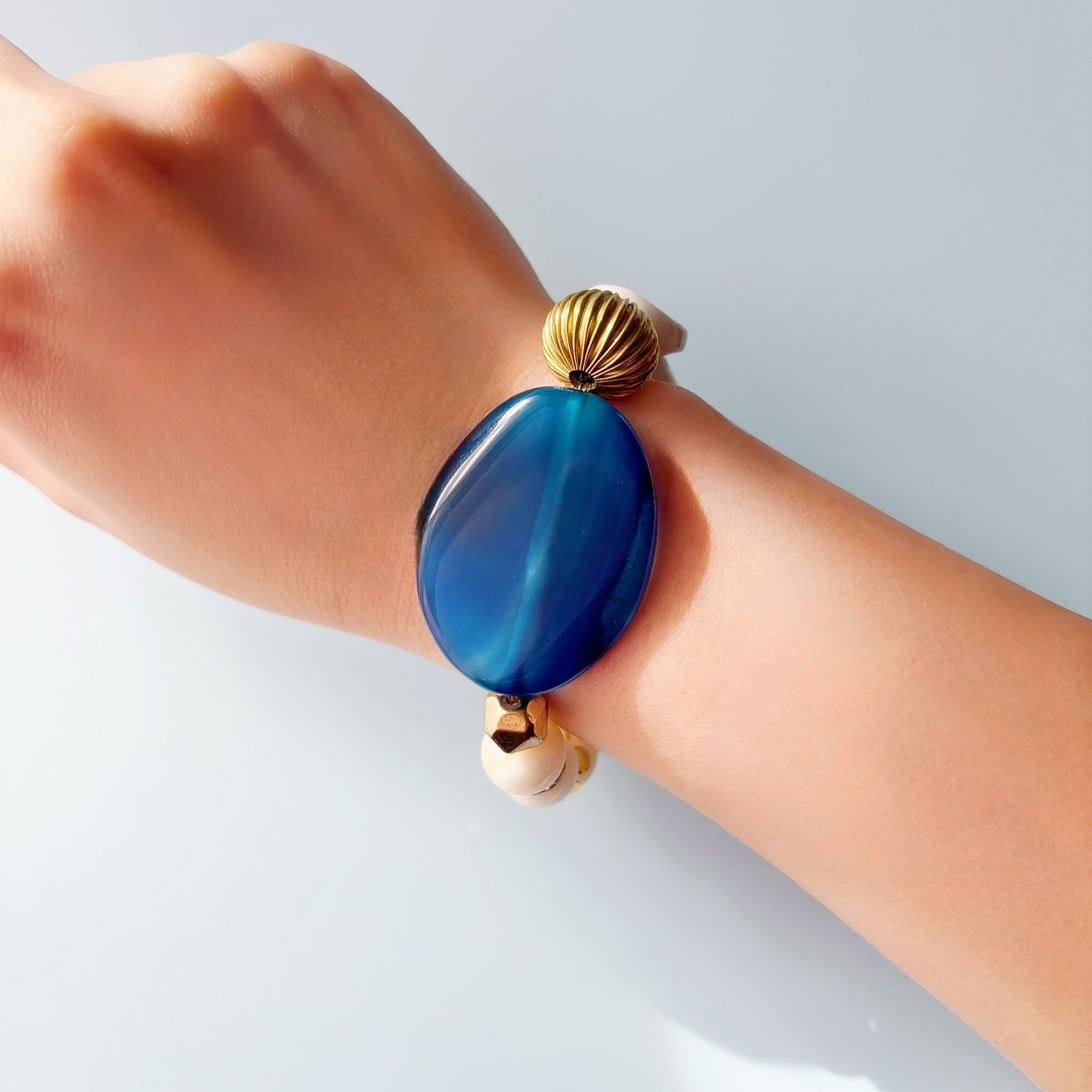 シンプルな服ほど差がつく!知性と余裕をまとう青×白の大人のパワーストーンブレスレット<ブルーメノウ×ハウライト×シャコ貝×ヘマタイト>