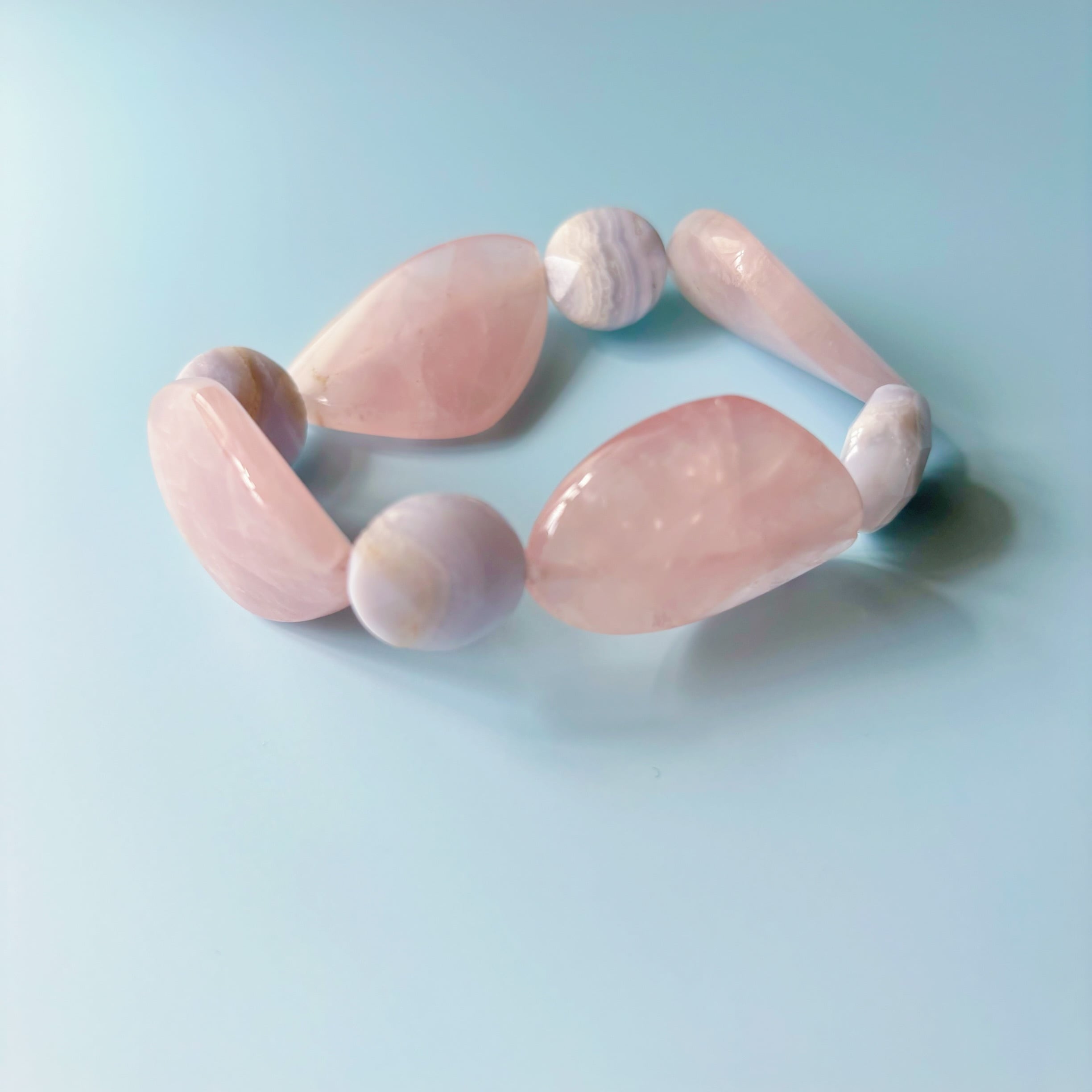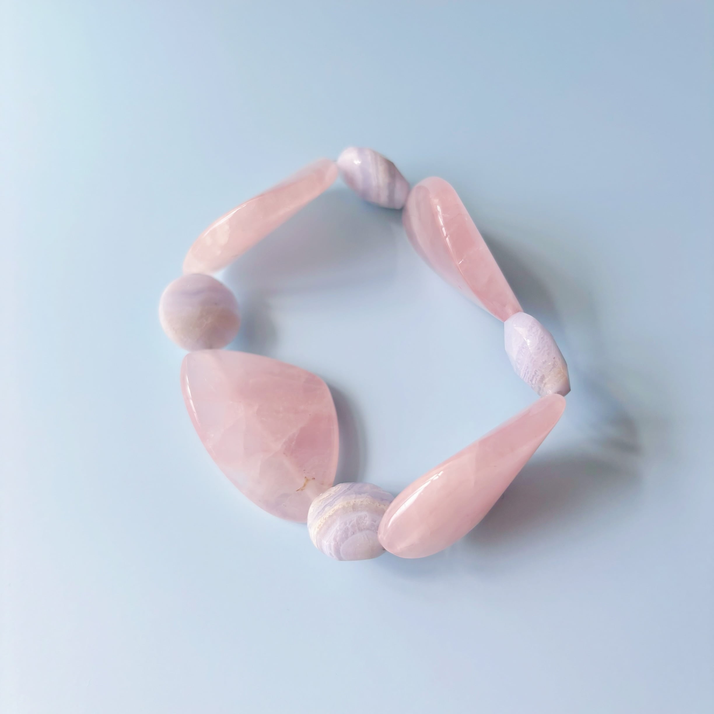 ー春月ソルベー春色ピンク×水色パステルカラー大ぶり天然石ブレスレット<ローズクォーツ×ブルーレースアゲート>